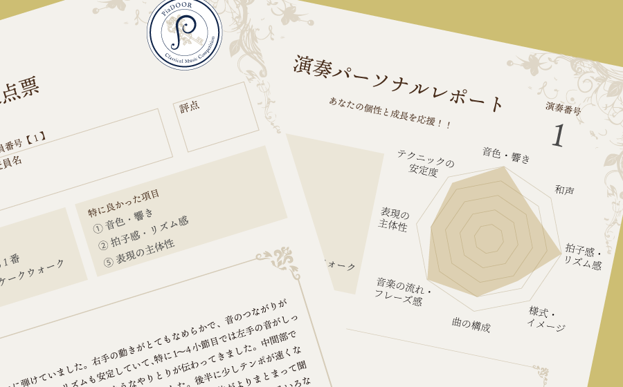 各審査員毎の講評はもちろん、【演奏パーソナルレポート】のレーダーチャートによって、演奏者の「魅力」と「可能性」が、立体的に浮かび上がります。