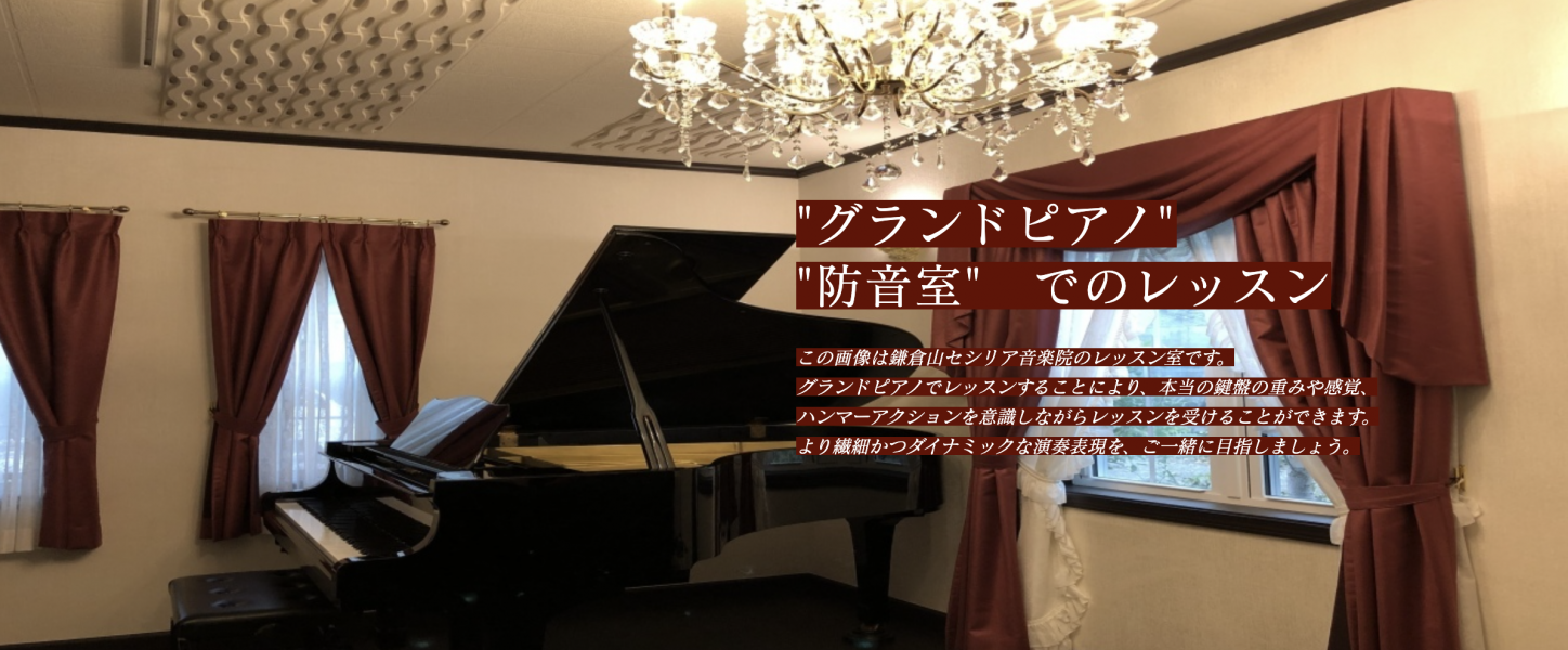 鎌倉山セシリア音楽院鎌倉山セシリア音楽院では、小さなお子さんの生徒さまから大人の生徒さままで、さまざまな年齢の生徒さまがピアノの演奏を楽しく学んでおられます。生徒さまがのびのびと楽しみながら、美しい音色でピアノを弾けるようになるために、演奏法のみならず、音楽史や楽理、さらに身体の使い方などの包括的なアプローチから、お一人おひとりに合わせたカリキュラムでピアノのレッスンをしております。初めてピアノを習う方はもちろん、これまで他の先生に習っていたけれどなかなか上達を感じられない方も、私たちとご一緒にピアノをはじめてみませんか?生徒さまお一人おひとりにあわせた無理のないカリキュラムで、丁寧に指導をさせていただきますのでどうぞご安心ください。- 鎌倉市鎌倉山2-2-24