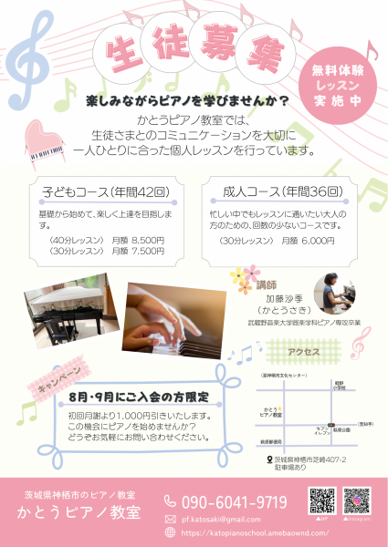 - 					かとうピアノ教室     かとうピアノ教室お子さまから大人の方まで一人ひとりに合わせて、楽しく、個人レッスンを行なっています。 無料体験レッスン承ります。 かとうピアノ教室お子さまから大人の方まで一人ひとりに合わせて、楽しく、個人レッスンを行なっています。 無料体験レッスン承ります。- 神栖市芝崎