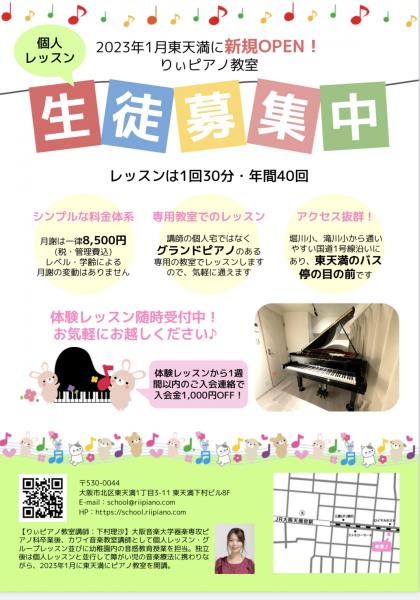 - 					りぃピアノ教室     りぃピアノ教室りぃピアノ教室は〈ピアノを通して音楽を楽しむ〉という考えの基でレッスンを行なっております。 お子様には ・できたことを一緒に喜ぶ&ほめる ・生徒の話をよく聞く ・自ら考えて行動する力を身につける ・子どもからの発信を大切に! 大人の方には ・”自分の時間”として ・好きなことをとことんする ・”楽しかった”が残るレッスン 上記を大切にレッスンさせていただきます♪ りぃピアノ教室りぃピアノ教室は〈ピアノを通して音楽を楽しむ〉という考えの基でレッスンを行なっております。 お子様には ・できたことを一緒に喜ぶ&ほめる ・生徒の話をよく聞く ・自ら考えて行動する力を身につける ・子どもからの発信を大切に! 大人の方には ・”自分の時間”として ・好きなことをとことんする ・”楽しかった”が残るレッスン 上記を大切にレッスンさせていただきます♪- 大阪市北区東天満