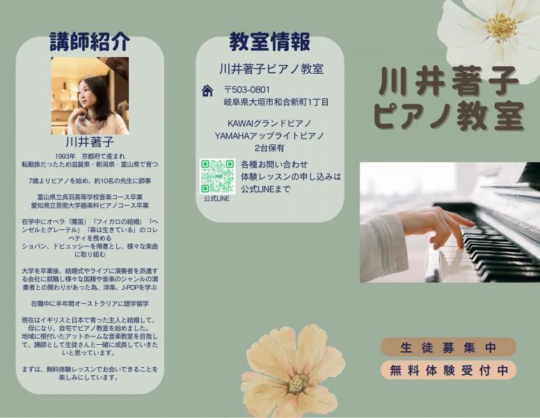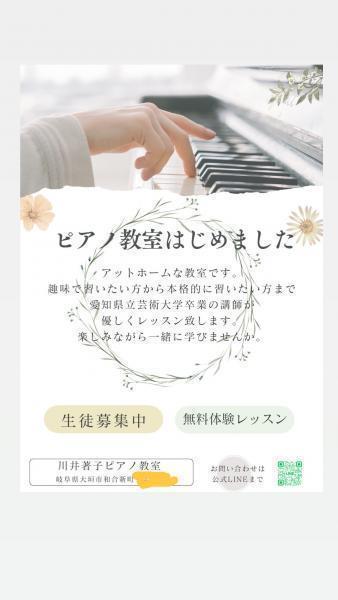 川井著子ピアノ教室アットホームなピアノ教室です。 趣味で習いたい方から、本格的に習いたい方まで、愛知県立芸術大学を卒業した講師がレッスンいたします。 楽しみながら一緒に学びませんか。- 大垣市和合新町1丁目